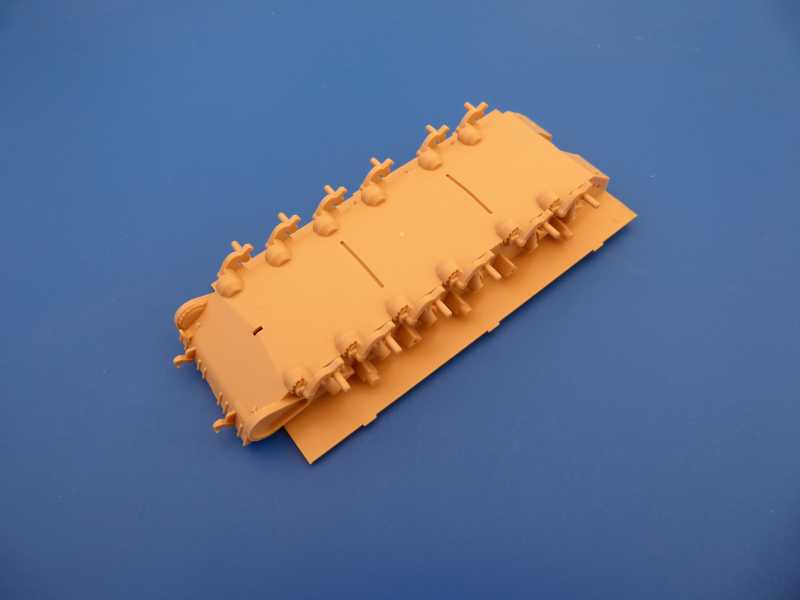 Die Wanne des Panzers besteht aus einer oberen und einer unteren Hälfte. Am Wannenoberteil und am Turm sind etliches Werkzeug, Rohrhalter sowie die Seitenschürzen bereits angegossen. Die Detaillierung ist trotzdem sehr fein und ausreichend. Dasselbe gilt für das Laufwerk, das, wie schon bei den anderen Bausätzen, aus einem Stück pro Seite besteht (plus den Oberteilen der Laufrollen) und dadurch den Zusammenbau extrem erleichtert.