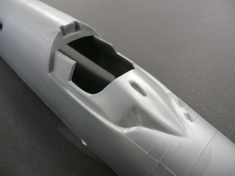 Das Pilotencockpit kann offen dargestellt werden, hier ist alles komplett, wenn auch zum Teil sehr rudimentär. Auch bei den Instrumenten sind alle Gravuren erhaben dargestellt, die Anordnung wirkt gegenüber dem Original etwas chaotisch. Der Schleudersitz hat angegossene Sitzgurte, die Abdeckung für den Ausschuss ist ebenfalls vorhanden. Die Arbeitsplätze der beiden anderen Besatzungsmitglieder sind nicht dargestellt, es sind lediglich die beiden Klarsichtteile (Fenster) in der Rumpfoberseite zu verbauen.