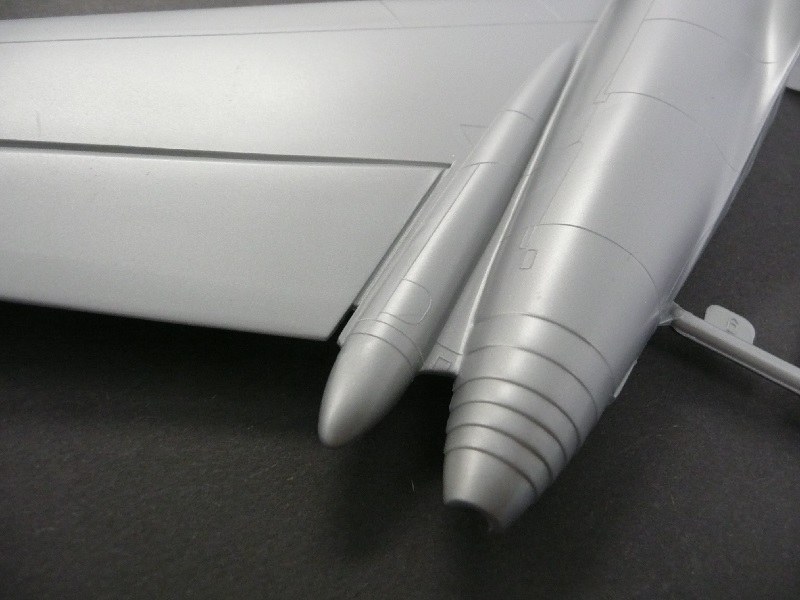 An der Unterseite der Cockpitwanne ist der vordere Fahrwerkschacht angegossen. Generell kann die ganze Konstruktion der Fahrwerke sehr gut überzeugen, hier fallen sehr wenig bis gar keine Nacharbeiten an. Die Verwendung der SAC-Metallfahrwerke empfiehlt sich, da der ganze Vogel doch ziemlich schwer wird. Entgegen der Bauanleitung sollte man die Fahrwerke erst zum Schluss einbauen. Die Reifen sind auf einer Seite nicht ganz ausgegossen, was man aber nach dem Zusammenbau nicht mehr erkennt (Zwillingsrädern sei Dank). Die Landescheinwerfer sind fix an der Fahrwerksstrebe angegossen, ein Ersatz aus Klarsichtmaterial macht hier mehr Sinn. Die vier Triebwerksgondeln bestehen aus je fünf Teilen. Die Lufteinläufe enden an drei Statoren und einer flachen Wand. Die Abgasrohre sind tief und enden im Innern an einer Reihe Turbinenschaufeln. Auch hier empfehlen sich Teile des Aftermarkets.