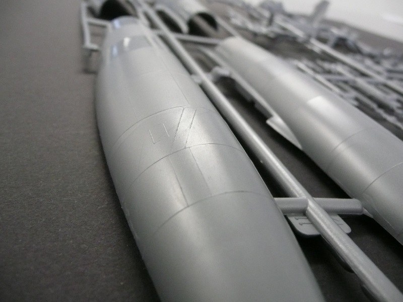 Zuladungen: Zentral unter dem Rumpf kann der später verwendete TCP (Two Component Pod) montiert werden. Es besteht aber auch die Option, nur den inneren Teil des TCP - also die Bombe - ohne den äußeren Treibstoffteil zu montieren. Ab 1961 wurden zwei weitere Bombenträger zwischen Zentralträger und den inneren Triebwerken nachgerüstet. Jeder dieser Träger konnte zwei weitere Atomwaffen vom Typ Mk43 tragen. Diese Träger samt Bomben liegen dem Kit ebenfalls bei. Die Bomben haben allerdings mit ihrem Original wenig gemeinsam. Wen das stört, der muss einmal mehr seine Eigenbau/Umbau-Fertigkeiten unter Beweis stellen.