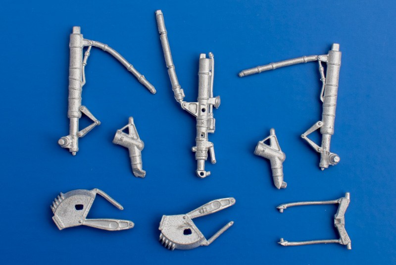 Für den 2016 erschienenen Bausatz der Flanker sind diese Teile gemacht worden. Besser gesagt von diesem kopiert worden. Die acht Metallteile entsprechen nämlich 1:1 dem Schachtelinhalt des Bausatzes. Es hätte sich ja durchaus angeboten, die oberen Zapfen der Hauptfahrwerke vor dem Abgießen an die Hauptteile anzukleben (Bausatzteile P6 und P7), so hat man nun anstelle einer soliden Kunststoffklebung eine mit Schnellkleber. Gut, im Falle eines Falles ist letztere schneller repariert und wohl auch stabiler, aber Sinn und Zweck sollte ja wohl eine höhere Stabilität von vorneherein sein. Die Teile sind etwas verbogen und müssen gerichtet werden. Außerdem ist wie immer etwas Grat vorhanden. Die Schärfe der Details hat durch den Kopiervorgang etwas nachgelassen, aber das kennt man ja bei diesen Sets.