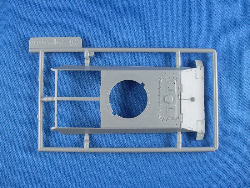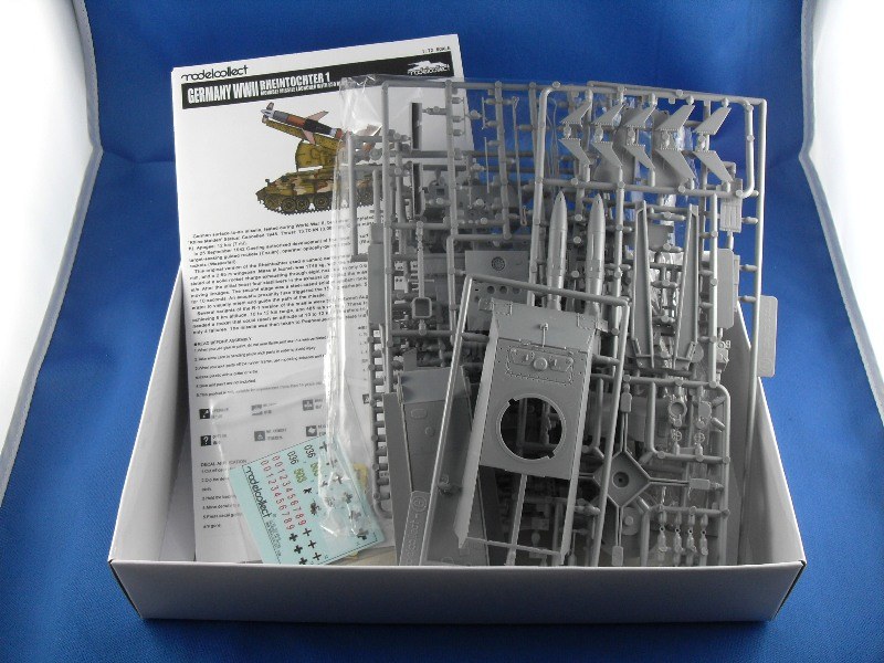 Dieser Bausatz von Modelcollect ist eine Zusammenstellung aus zwei verschiedenen bereits erschienenen Bausätzen: E-50 Medium Tank und Rheintochter. Dieser E-50 dürfte wohl eher unter die Kategorie "Was wäre wenn" fallen, da es keinerlei Aufzeichnungen zu diesem Konzept gibt. Nichtsdestotrotz ist dieses Fahrzeug durchaus sehr interessant. Der Bausatz besteht aus insgesamt elf Spritzlingen, einer Plastikwanne, einer Fotoätzplatine sowie einem Decalbogen und der Anleitung. Wie auch schon bei den meisten anderen Fahrzeugen der E-Serie, wurde der Motorenraum detailliert und mit entsprechenden Details ausgestattet. Wie bei Modelcollect üblich, sind alle Teile sauber verarbeitet und fein detailliert. Aufgrund der übersichtlichen Montageanleitung lässt sich der Bau rasch realisieren. Der Decalbogen ist überschaubar und dient auch anderen Fahrzeugen der E-Serie. Er ist sauber gedruckt.