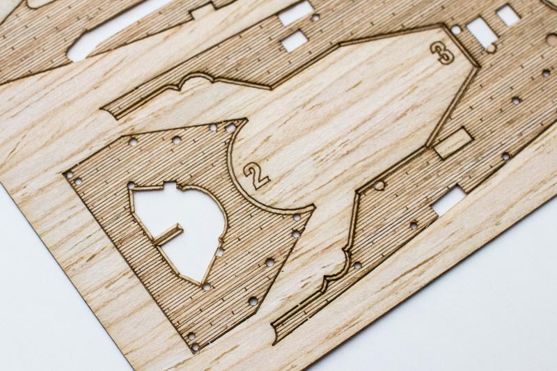 Das Set besteht aus einer einzelnen Platte mit neun Segmenten. Die Konturen sind randscharf mittels Lasercut vorgeschnitten. Zahlreiche Aussparungen umgehen die auf dem Kunststoffteil befindlichen erhabenen Details. Interessant wird's im Bereich rund um die Barbetten der Hauptgeschütze, dort sind die mit "Holz" gefüllten Zwischenräume teilweise extrem dünn. Natürlich handelt es sich hier nicht um Holz, dafür wäre das Material bei einer Stärke von nur 0,15mm viel zu brüchig. Vielmehr ist es eine entsprechend bedruckte und strukturierte Folie, die sich wie Holz anfühlt aber wesentlich stabiler ist. Der Kleber sollte ausreichend stark sein, so dass man auch die passenden Masken verwenden können sollte. Die einzelnen Bretter bzw. Bereiche sind leicht unterschiedlich, so dass das Deck am fertigen Modell etwas lebendiger aussieht.