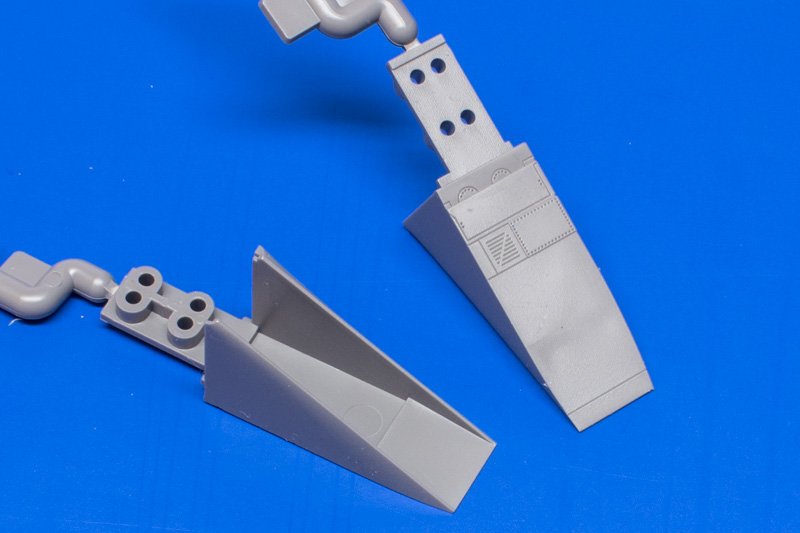 Hat man den Rumpf dann endlich zusammen sind die Fahrwerke an der Reihe. Hier schwächelt der Bausatz. Die Teile gefallen mir jetzt nicht so gut. Es gibt einige deftige Auswerferpins an den Teilen und manche Bereiche sind einfach nur plump, wie z.B. die massiv gegossenen Federbeinscheren. Die Metallfahrwerke von SAC sind da auch keine echte Alternative. Hier sollte man etwas Arbeit investieren und z.B. ein paar Leitungen anbauen, die nicht durchbrochenen Teile überarbeiten und noch das eine oder andere Detail ergänzen. Die Räder sind ganz passabel, der Reifen und die Felge sind spearate Teile, das eine schwarz, das andere weiß. Die Montage der Fahrwerksklappen ist geschickt gelöst, da dort auch eine Wand des Schachtes angespritzt ist können sie einfach eingesteckt werden, über den korrekten Winkel braucht man sich keine Gedanken zu machen. Die vordere Klappe, die später noch geöffnet ist, muss man wie im Bauplan angegeben anbauen, sonst bekommt man die nicht mehr in den engen Spalt zwischen Schacht und Fahrwerksbein. Ein weiterer Schwachpunkt des Bausatzes neben den Fahrwerken sind die Schubdüsen. Die Teile ohne die "Turkey-Feathers" sind, wohlwollend ausgedrückt, ein Witz. Ich habe selten so schlecht gemachte Teile gesehen. Die alternativen Teile für die General Electric Triebwerke sind zwar auch kein Wunder der Spritzgusstechnik, aber immerhin halbwegs ansehnlich. Das Multi Coloured Parts Prinzip wurde hier nicht korrekt umgesetzt, die Düsen sind nämlich schwarz, eigentlich hätten sie an den metallbedampften Rahmen gehört. Dann hätten nämlich auch die Decals für die teilweise überdeckten Bereiche der Verkleidungsbleche Sinn gemacht. Ist natürlich nur für diejenigen relevant, die das Modell nicht bemalen wollen.