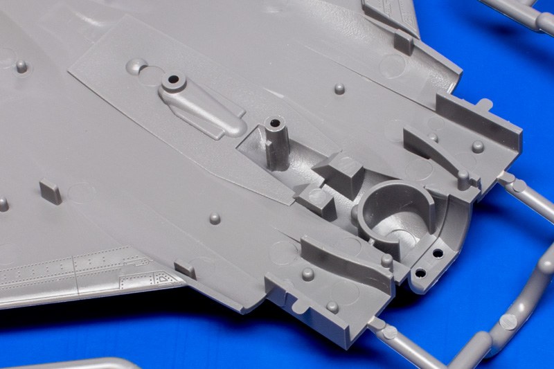 Der Zusammenbau beginnt ausnahmsweise mal nicht mit dem Cockpit, sondern mit den Einlasskanälen. Die beiden Lufteinläufe werden aus zwei Hälften zusammengesetzt und als Modul in die untere Rumpfhälfte eingesetzt. Die Fahrwerksschächte sind Teil der Unterseite dieser Baugruppe. Es gibt dann natürlich eine Klebenaht im Inneren der Kanäle, aber man müsste schon mit einer Lampe hineinleuchten, um ihn zu sehen. Die vorderen Enden der Einlasskanäle sind so ausgeformt bzw. ausgeklinkt, dass eine Bemalung überflüssig wird. Die schrägen Einlauflippen mit den typischen verstellbaren Rampen werden erst später angesetzt. Je nachdem für welche Triebwerksausführung man sich entscheidet, kommen unterschiedliche erste Verdichterstufen zum Einsatz. Vor dem Einsetzen der Baugruppe in die untere Rumpfschale muss man noch die kleinen, schräg angeordneten Streben der Hauptfahrwerksbeine einkleben. Die aus schwarzem Kunststoff gespritzten Abgasrohre werden in ähnlicher Weise erstellt, allerdings werden diese zuerst mit dem separaten Segment des Unterrumpfes verklebt, welches beim Original unlackiert und hier metallbedampft ist. Wäre da nicht eine unschöne Schliere auf der Außenseite, könnte man das so belassen. Das Multi-Color-Prinzip ist schon praktisch, führt hier aber zu einem vielteiligen Rumpf.