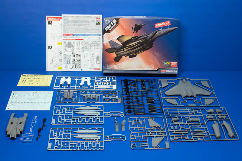 Der Bausatz ist zuvor bereits als reguläre F-15E der USAF erschienen. Bei Academy gibt es zwei Produktlinien, einmal die "Modelers Edition" mit einfarbigen Kunststoffteilen und regulären Decals sowie die hier vorliegende "Multi Coloured Parts Edition" mit verschiedenfarbigen Teilen und zusätzlich einem Bogen mit Aufklebern. Diese MCP Editionen richten sich an ambitionierte Einsteiger, die vielleicht erst mal ohne großartige Bemalung zu einem schönen Ergebnis kommen wollen. Die Teile sind logisch eingefärbt, die Rumpfteile in Gunship Grey, Fahrwerke und Einlasskanäle in Weiß, Cockpit, Abgasrohre, Schubdüsen in Schwarz sowie die Außenlasten in einer Art Ghost Grey. Außerdem gibt es noch einen Rahmen mit metallbedampften Bauteilen. Hier findet man die Rumpfteile, die beim Original unlackiert sind, wie z.B. den Triebwerksbereich. Die Detaillierung im Außenbereich ist hervorragend. Es gibt unzählige feine Panellines, einige Nietenreihen sowie erhabene Details wo erforderlich.