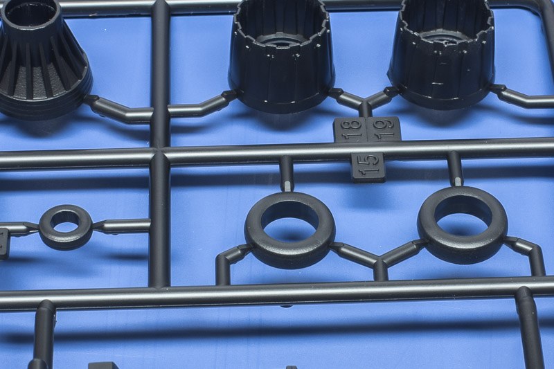 Hat man den Rumpf dann endlich zusammen sind die Fahrwerke an der Reihe. Hier schwächelt der Bausatz. Die Teile gefallen mir jetzt nicht so gut. Es gibt einige deftige Auswerferpins an den Teilen und manche Bereiche sind einfach nur plump, wie z.B. die massiv gegossenen Federbeinscheren. Die Metallfahrwerke von SAC sind da auch keine echte Alternative. Hier sollte man etwas Arbeit investieren und z.B. ein paar Leitungen anbauen, die nicht durchbrochenen Teile überarbeiten und noch das eine oder andere Detail ergänzen. Die Räder sind ganz passabel, der Reifen und die Felge sind spearate Teile, das eine schwarz, das andere weiß. Die Montage der Fahrwerksklappen ist geschickt gelöst, da dort auch eine Wand des Schachtes angespritzt ist können sie einfach eingesteckt werden, über den korrekten Winkel braucht man sich keine Gedanken zu machen. Die vordere Klappe, die später noch geöffnet ist, muss man wie im Bauplan angegeben anbauen, sonst bekommt man die nicht mehr in den engen Spalt zwischen Schacht und Fahrwerksbein. Ein weiterer Schwachpunkt des Bausatzes neben den Fahrwerken sind die Schubdüsen. Die Teile ohne die "Turkey-Feathers" sind, wohlwollend ausgedrückt, ein Witz. Ich habe selten so schlecht gemachte Teile gesehen. Die alternativen Teile für die General Electric Triebwerke sind zwar auch kein Wunder der Spritzgusstechnik, aber immerhin halbwegs ansehnlich. Das Multi Coloured Parts Prinzip wurde hier nicht korrekt umgesetzt, die Düsen sind nämlich schwarz, eigentlich hätten sie an den metallbedampften Rahmen gehört. Dann hätten nämlich auch die Decals für die teilweise überdeckten Bereiche der Verkleidungsbleche Sinn gemacht. Ist natürlich nur für diejenigen relevant, die das Modell nicht bemalen wollen.
