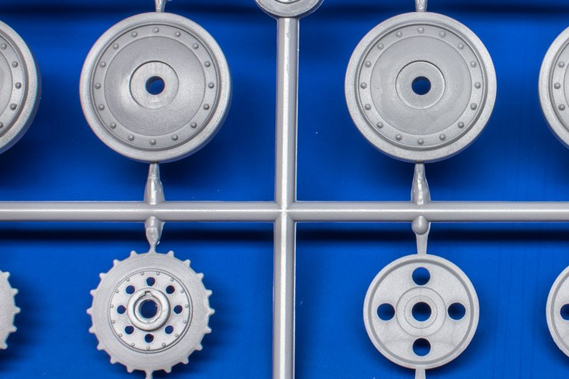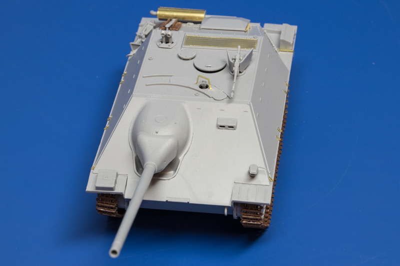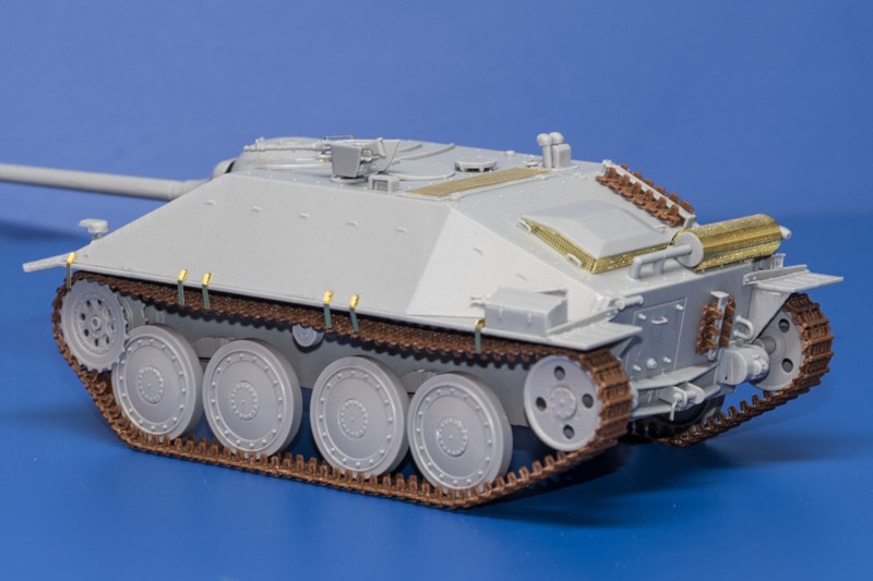 Was die Teileanzahl angeht ist der Bausatz recht übersichtlich gehalten, neben den 234 Kettengliedern sind lediglich "nur" noch weitere 176 Kunststoffteile und 23 Ätzteile vorhanden. Für einige der Bauteile vom Rahmen "P" gibt es in der Anleitung keinerlei Hinweise, es handelt sich im Wesentlichen um ein paar Werkzeuge sowie Seilkauschen für zwei Abschleppseile. Ein passendes Garn oder Drahtlitze liegen allerdings keine dabei. Die Detaillierung der Bauteile ist gut bis sehr gut, natürlich ist vieles hier fiktiv und man hat sich diesbezüglich sicherlich am Hetzer orientiert, mit dem dieses Fahrzeug eine sehr große Ähnlichkeit besitzt. Die Kanone ist aus einem Stück gegossen und kann beweglich eingebaut werden. Bis auf eine Luke im Dach sind alle anderen nur geschlossen anzubauen, eine Inneneinrichtung gibt es verständlicherweise nicht. Bis auf einige Anbauteile ist das Fahrzeug relativ "clean". Das Laufwerk ist sehr simpel aufgebaut und die Lauf- und Leiträder können drehbar angebaut werden. Die Passung ist aber teilweise sehr eng, so dass man auf dieses Feature besser verzichet und die Teile gleich fest verklebt.