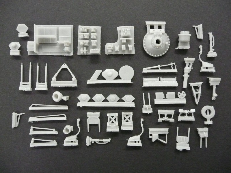 Kabine:Die größten Kabinenteile sind die Kabinendecke, Kabinenboden und die beiden Seitenwände. Alles ist auch hier sehr fein strukturiert. Die Klappsitze an den Seitenwänden können hoch- oder heruntergeklappt verbaut werden. Die Streben der Sitze sind sehr filigran, beim Säubern/Entgraten und beim Entfernen der überflüssigen Streben ist große Vorsicht geboten (Abbruchgefahr!). Die Sitzgurte sind als Ätzteile ausgeführt.