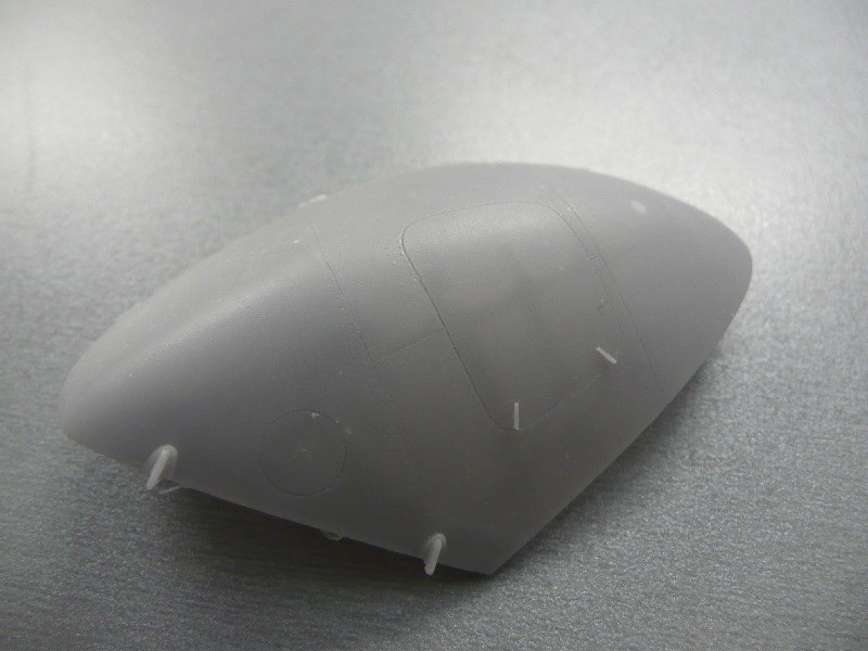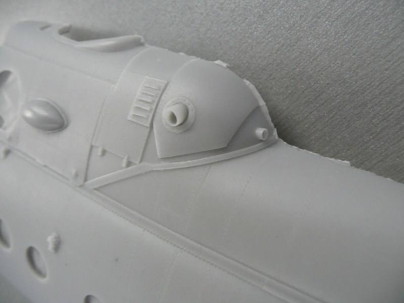 Rumpf:Wie bereits erwähnt ist der Rumpf in mehrere große Teile gegliedert. Ein Trockenpassen ist unbedingt notwendig, da vor allem die beiden vorderen Rumpfhälften Verzug/Verformung aufweisen. Unüblich für Resinteile weisen die Rumpfhälften, Heckauslegerhälften und die Kabinendecke Passstifte auf, welche den Zusammenbau und das Ausrichten erleichtern. Ins Auge sticht an allen Rumpfteilen die überaus akkurate Außenstruktur. Alle Nietreihen sind fein versenkt vorhanden, Paneltrennlinien sind ebenfalls versenkt. Anbauten wie APU-Abgasrohre, Partikelausstoßrohre, Schiebetür-Schienen, Schnellverschlüsse, Schwenktorscharniere oder die Aufhängungen der Fahrwerksstreben und Waffenausleger sind originalgetreu und hauchdünn dargestellt. Innen weisen die Rumpfschalen keine Struktur auf, da für den Innenbereich eigene Bauteile vorgesehen sind. Ein separates Bauteil ist die Rumpfunterseite. Dessen Einbau wird in der Anleitung nirgends erwähnt, dürfte aber eine ziemliche Fummelei werden wegen der Ausrichtung zu allen anderen Teilen. Generell wird ein simpler Zusammenbau durch die Aufteilung in Rumpfteile und Kabinenteile verunmöglicht, da mehrere Arbeitsschritte im Außen- und Innenbereich ineinander laufen. Einen goldenen Weg zum Zusammenbau gibt es nicht, die Anleitung ist nicht zu 100% vollständig.
