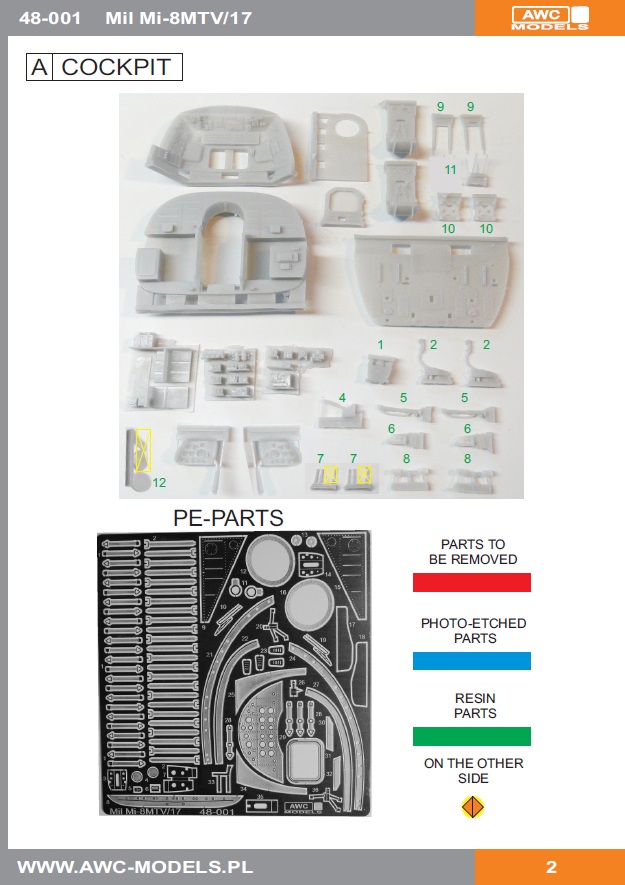 Das Modell:Trotz dem Bekanntheitsgrad des Musters sind 1:48er Modelle davon spärlich, in Spritzguss gar nicht vorhanden (Stand 2017). Ab 2016 war das hier vorliegende Modell von AWC Models aus Polen verfügbar. Der stabile Stülpkarton ist prall gefüllt mit sehr sorgfältig verpacktem Inhalt. Größere Teile wie Rumpfhälften, Kabinenboden und Heckausleger sind einzeln verpackt, die Kleinteile sind zusammen in mehreren kleinen Säckchen untergebracht. Insgesamt gilt es, über 220 Resinteile, Klarsichtteile und Ätzteile zu verbauen, wobei die größten Teile die Strukturteile wie Rumpfhälften, Heckausleger, Kabinen- und Getriebeboden, Kabinenwände, Rotorblätter und Schwenktore sind. Nur wenige Kleinteile werden beim Bau nicht benötigt, diese sind in der Anleitung gelb markiert.