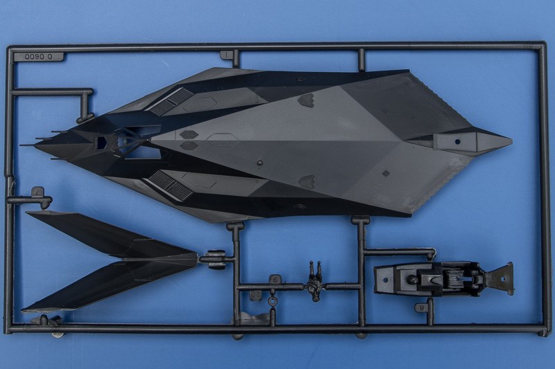 Der Bausatz stammt laut Gravur aus dem Jahre 1992, es waren also schon weitaus mehr Einzelheiten über die F-117 bekannt, als bei den ganz frühen Bausätzen. Mit gerade einmal 37 Einzelteilen ist das Modell recht überschaubar aufgebaut. Das spiegelt sich ein Stück weit auch in der Detaillierung wieder. So besteht das Cockpit aus nur einem einzigen Bauteil - Wanne, Sitz, Instrumentenbrett und sogar der FLIR Kopf wurden zusammengefasst.