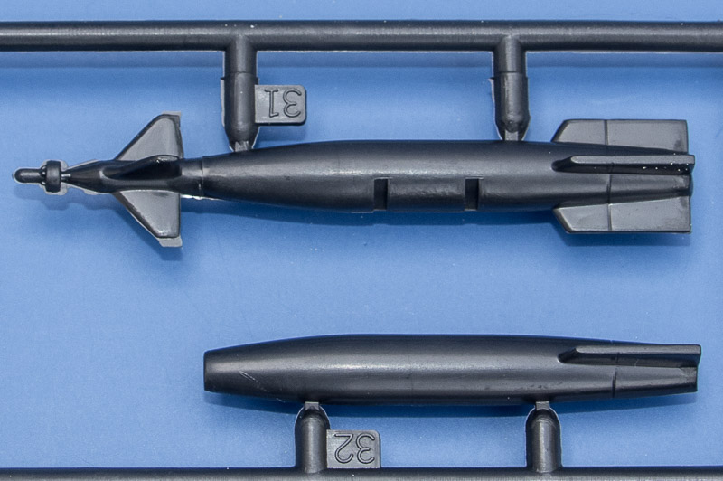Sehr schade finde ich die angegossenen Steuerflächen. Auf nahezu allen Originalbildern sieht man die Leitflächen zumindest teilweise ausgelenkt. Man kann dies aber durchaus bewerkstelligen, die Schnittkanten sind ja vorgegeben. An Zuladung liegen zwei recht einfach gemachte GBU-10 lasergelenkte Bomben bei. Im Walk Around Heft von Squadron Signal sind ein paar schöne Modellvorlagen enthalten, wo eine F-117 gerade beladen wird.