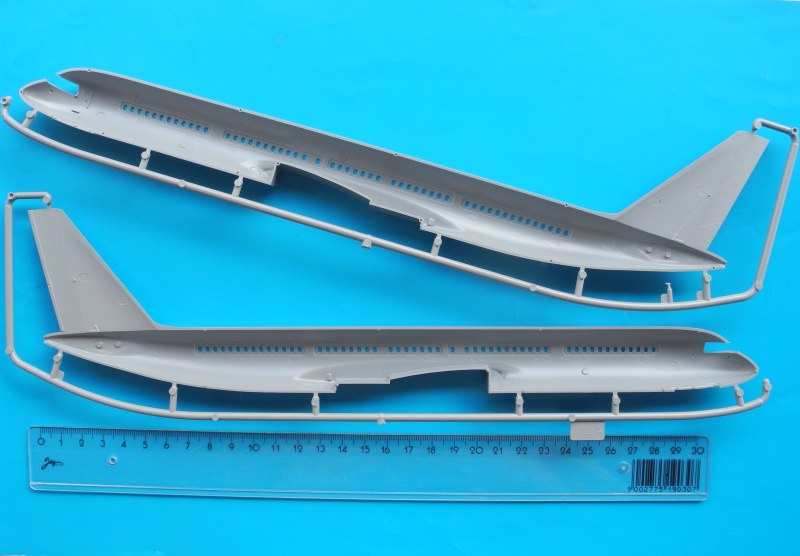 Einige Vereinfachungen gegenüber IL-62 und Airbus-Bausatz gibt es leider schon: Alle Steuerflächen sind fix in neutraler Stellung mitgespritzt. Also keine Darstellung des Flugzeuges auf der Runway ohne der sonst üblichen Schnitzerei. Auch gibt es, wie sonst bei Revell, Eastern Express usw., nur die Möglichkeit, das Fahrwerk ausgefahren und eingefedert wie beim Rollen und Parken, oder eingezogen wie im Flug darzustellen. Und: es liegt kein Ständer bei, sondern der Hinweis, dass man diesen unter Katalognummer 7235 erwerben kann. Aber sonst ... schaut euch die Details an: