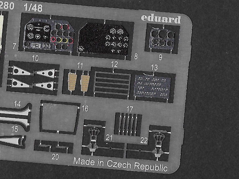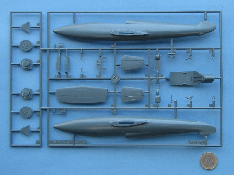 Wer die He 280 in 1:48 bauen möchte kommt an dem Bausatz von Eduard nicht vorbei. Keine andere Firma bietet das Modell in dieser Größe an. Ein Vergleich mit den Vorgänger-Bausätzen aus dem Jahr 1999 zeigt keine Veränderung an den Spritzlingen. Für diese ProfiPACK-Version hat Eduard eine neue Ätzteilplatine entwickelt, die jetzt teilweise vorlackierte Bauteile enthält. Auch der Markierungs- und Maskierungsbogen ist neu. Die Resinteile, der Fotofilm oder das Gewicht aus den alten Bausatz-Versionen sind nicht mehr enthalten. Die versenkten Gravuren und anderen Details sind immer noch auf Höhe der Zeit. Es sind Bauteile für die Jumo 004 und die HeS 8a-Triebwerke enthalten. Alle Ruderflächen sind nicht eingelenkt darstellbar. Das Cockpit und der Schleudersitz sind etwas spartanisch ausgestattet. Da das Klarteil recht groß ist und sogar geöffnet dargestellt werden kann, ist hier etwas Fleißarbeit gefragt. Leider hat bis heute kein Zurüstanbieter Austausch- oder Zusatzresinteile für diesen Bausatz im Angebot. Man müsste ausprobieren, ob zumindest der markante Schleudersitz aus der He 162 verwendet werden kann. Leider gibt es nicht viele Fotos aus dem Cockpitbereich der He 280.