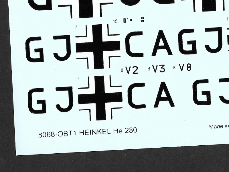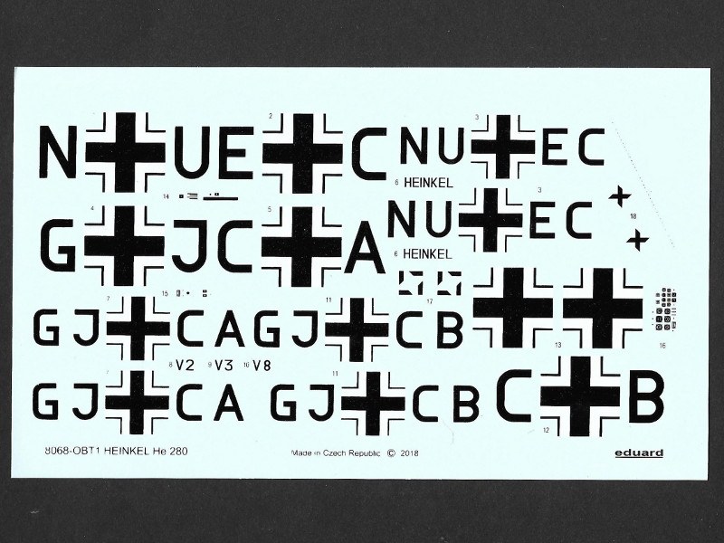 Die Bauanleitung ist leicht verständlich aufgebaut. Es ist vermerkt, nicht das Gewicht für die Rumpfspitze zu vergessen, doch wie viel Gramm das sein sollen ist nicht angegeben. Der von Eduard gedruckte Markierungsbogen ist augenscheinlich dünn gedruckt und ermöglicht die Darstellung von drei Versionen der He 280 (2x Jumo 004 und 1x HeS 8a). Darstellbare Maschinen: