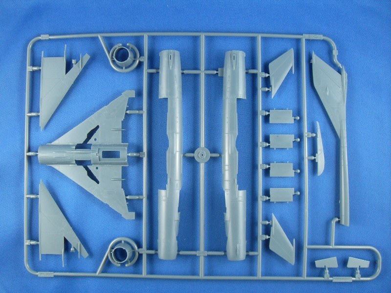 70141X - MiG-21MF Interceptor OVERTREESSeit etwa drei Jahren bietet Eduard nun die "Overtrees" in seinem Online-Shop an. Für die brandneue MiG-21MF in 1:72 gilt dies natürlich auch; das zur Freude der Modellbauer. Denn wie so oft ermöglicht der Hauptbausatz, in diesem Falle das ProfiPack, verschiedenste, sehr attraktive Bemalungsvarianten. Für günstiges Geld kann man nun den reinen Plastibausatz, ohne Decals und Anleitung, erwerben. Der vorliegende "Overtree" beinhaltet die bereits bekannten vier Plastikspritzlinge A, C, D, E für die Abfangjägerversion. Die Qualität ist, wie nicht anders zu erwarten, sehr gut! Der Bausatz zeichnet sich durch sehr feine versenkte Gravuren und Details aus. Er ist sehr sauber geformt und Fischhaut sucht man vergebens. Auch die Klarsichtteile sind sehr gut verarbeitet.