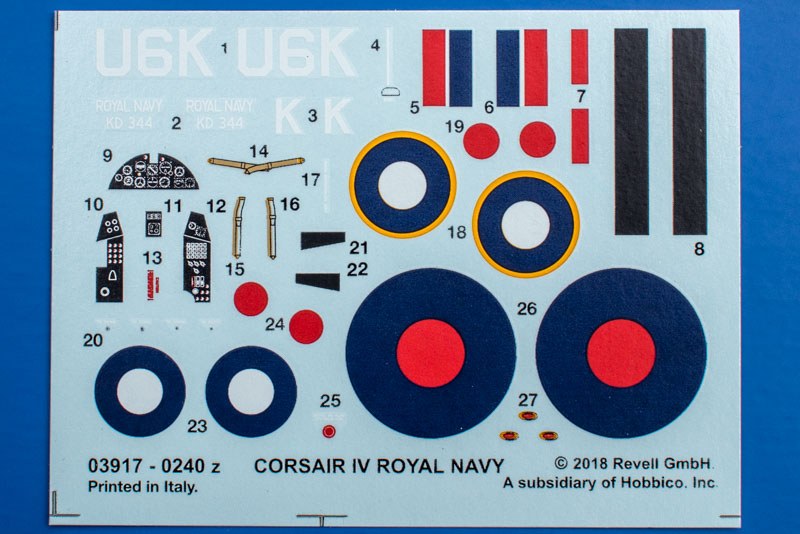 Die Corsair der Fleet Air Arm flogen normalerweise nicht mit den 150gal Zusatztanks, daher sind die Bausatzteile eher nicht zu gebrauchen. Stattdessen wären Bomben britischer Bauart sinnvoll gewesen. Hier muss man also entsprechende Teile aus anderen Bausätzen beisteuern. Leider hat Revell auch nicht die stromlinienförmigen Verkleidungen für die Pylone beigelegt, wenn man nichts drunterhängen will. Der Decalbogen stammt aus Italien und wurde bei Zanchetti gedruckt. Es gibt einen leichten, nicht linearen Versatz im Druck, besonders auffällig bei den Gurten (Decals 12 und 16). Revell hat da schon bessere Sätze ausgeliefert. Ich habe aber auch schon Bilder von Bögen gesehen, die in Ordnung waren. Ggf. die Abteilung X kontaktieren für Ersatz. Es gibt nur eine einzige Option, nämlich die KD344 der No.1846 Sqn, die im Juli 1945 auf der HMS Colossus stationiert war. Die Maschine war offensichtlich in einen Landeunfall am 8. Juli verwickelt, als Sub-Lt J.D. Garden RNVR das Seil verfehlt und in den Schiffskränen zum Stehen kam. Die Kennungen KD/KEXXX wurden für die Corsair Mk.IV vergeben, also für die Goodyear FG-1D Modelle. Etwas fragwürdig sind die von Revell beigelegten Roundels, bei den im Pazifik eingesetzten Corsair wurden diese modifiziert, um sich besser gegen die japanischen Hinomarus abzuheben. Das Typ "B" Roundel auf der Flügeloberseite ist daher sehr fragwürdig (der Erbauer des Bauplanmusters sah dies wohl auch so). Eine endgültige Bestätigung hierfür habe ich nicht gefunden, auch die Themen auf diversen Foren halfen nicht wirklich weiter. Jeder sagt was anderes und "die anderen" haben sowieso unrecht ;) Ich tendiere zu einem Typ "C" mit einem weißen Rand um den roten Punkt in der Mitte.