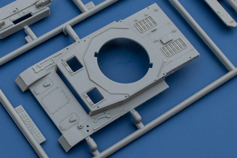 Die Tatsache dass hier ein Grundbausatz plus Zusatzteile geschaffen wurde führt zu der für ein 1:72er Modell recht hohen Teileanzahl von knapp 200 verteilt auf 6 Rahmen. Viele Teile beiben ungenutzt und können für Umbauten etc. verwendet werden. Schade dass man die paar Teile für das Turmgehäuse aus den Rahmen ausgespart hat, der "Kleinkram" ist aber noch vorhanden. Die Detaillierung dieses kleinen Panzers kann sich wirklich sehen lassen. Der Zusammenbau erfolgt in der für Revell bekannten Art und Wiese beginnend mit der Unterwanne die inklusive Kettenlaufwerk fertig montiert werden soll bevor die Oberwanne begonnen wird. Die Schwingarme sind bereits an der Wanne angegossen was die Arbeit erleichtert. Die Kette ist aus Segmenten aufgebaut, anders als beim zeitgleich wieder aufgelegten "Luchs" ist das obere Segment kerzengerade ohne Durchhang gegossen. Einige Anbauteile wie z.B. die Abgasanlage komplettieren die Unterwanne. Die Oberwanne besteht aus nur wenigen Teilen und wird mit diversen, separat ausgeführten Ausrüstungsgegenständen, Ersatzlaufrollen und -Kettengliedern detailliert.