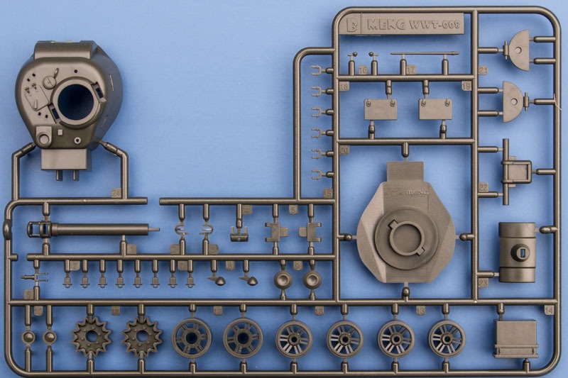 Unser Sherman hier besteht aus knapp 80 Einzelteilen die sich auf zwei Teilerahmen verteilen. Nicht wenige davon sind irgendwelche Ösen, Laschen und kleinere Anbauteile. Diese verleihen dem Modell einen gewissen Grad an Detaillierung, ansonsten sind die Teile recht einfach und eher glatt ausgeführt. Das Kettenlaufwerk besteht neben dem Leit- und Treibrad aus nur einem einzigen Rollenwagen. Die Kette ist eine relativ dicke Gummiwurst wie sie auch bei den Spielzeug-Modellautos à la Siku und Konsorten verwendet wird. Ein paar Decals sind auch vorhanden, genau wie bei den "Großen". Die farbige Anleitung im DIN A5 Format ist recht nett remacht und errinnert irgendwie an die Manuals die den Computerspielen beiliegen. Es gibt sogar eine richtige Bemalungsanleitung mit Farbangaben für Meng/AK und Mr Hobby Acrysion Farben.