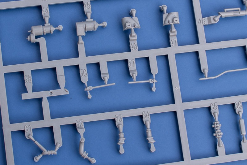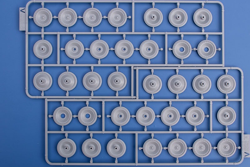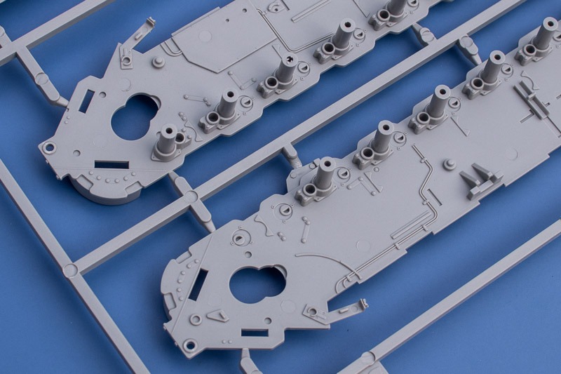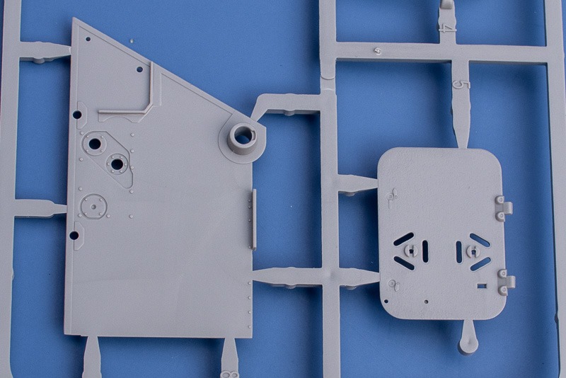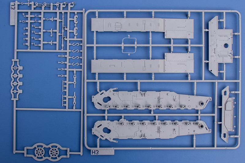 Die Details: Die Qualität der gegossenen Bauteile ist sehr gut, ohne nennenswerte Grate, Fischhäute oder Auswerferstellen an nach außen sichtbaren Bauteilen. Alle Bauteile überzeugen durch eine feine Detaillierung. Auf der Innenseite der Oberwanne, an der Innenseite der Schürzen, Innenseite der Motorabdeckung, Innenseite der Klappen an der Turmöffnung sind Auswerferstellen erkennbar. Diese lassen sich allerdings mit einer feinen Feile schnell und einfach entfernen. Das ZF 7-200 Schaltgetriebe, Hauptkupplung Lenkgetriebe, Lenkbremsen, Anbauteile, der Innenraum mit Drehstabfederung, Gelenkwellen, Werkzeugkisten, Bodenabdeckbleche, Feuerschutzwand, rechte & linke Kühlergruppe, Tankanlage, der Maybach HL 230 P30 Motor usw. sind hervorragend und absolut authentisch reproduziert. Antriebs-, Lauf-, Kettenspannräder & Schwingarme sind ebenfalls sehr schön nachgebildet. Die Schwingarme könnten so verklebt werden, dass in Kombination mit der Drehstabfederung ein bewegliches Fahrwerk dargestellt werden kann. Nur leider würde dies keinen Sinn ergeben, wenn man die im Bausatz befindliche Segmentkette verbaut.