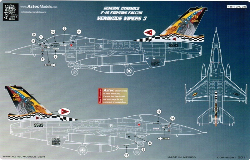 Besprechung:Nahezu regelmäßig erscheinen Bausätze der F-16 mit Sonderlackierung. Meist beschränken sich aber die Hersteller auf US-amerikanische oder westeuropäische Sondermaschinen, was wirklich sehr schade ist, denn die F-16 wird schließlich weltweit eingesetzt. Venezuela war 1982 das erste lateinamerikanische Land an welches die F-16 exportiert wurde. Zum 25. Jubiläum erhielten zwei Maschinen des 16. Jagdfliegergeschwaders „Dragones“ (dt. Drachen) eine Sonderlackierung. Der mexikanische Hersteller Aztec Models hat sich dieser Lackierung angenommen und in einem kleinen, aber feinen Decalbogen umgesetzt. Wie gewohnt, sind die Decals sauber und versatzfrei gedruckt. Den Decals liegen zwei Hinweisblätter bei, welche jeweils den Einsitzer (Takt.-Nr. 8924) und Doppelsitzer (Takt.-Nr. 9583) zeigen. Für einen akzeptablen Preis i. H. v. 10,20 $ erhält man ein ordentliches Decalset, was eine exotische Abwechslung zu den ganzen „Tigermeets“ und „NATO“ Lackierungen gibt. Erhältlich ist das Set direkt bei Aztec Models. Weitere Bilder