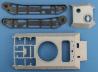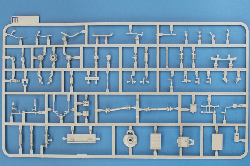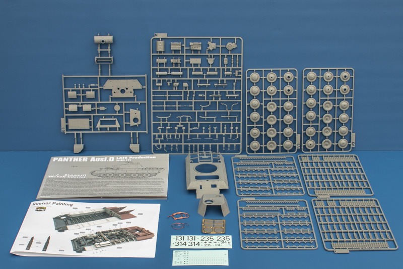 Der Bausatz des Panthers von Takom ist noch recht jung und 2018 zunächst als Ausf.A in diversen Deklinationen erschienen. Nach zwei Bergepanthern (Ausf. A und D) war es nur eine Frage der Zeit bis auch die reguläre Ausf.D nachgelegt wird. Allen gemeinsam ist die vollständig nachgebildete Innenausstattung wodurch diese Bausätze zu wahren Teilemonstern werden. Der großzügig dimensionierte Karton ist prall gefüllt mit seinen 29 Teilerahmen, der einzeln beiliegenden Wanne und Drehturm, den Montagehilfen für die Kette und noch etwas „Kleinkram“ in Form einer kleinen, mit Gittern bestückten Ätzteileplatine und einigen Stücken verdrillter Kupferlitze die als Stahlseile dienen. Eine spontane Volkszählung ergab knapp 1.050 Einzelteile, was angesichts der teilemäßig übersichtlichen Segmentkette richtig viel Zeug ist! Die meisten der Rahmen sind schon aus dem frühen Panther bekannt. Neu hinzugekommen sind die Rahmen C, E3, N und V3, im Gegenzug entfielen die Rahmen W, X, Y und L3. Die Laufrollen sind auch in der frühen Ausführung enthalten so dass man seinen Panther frei bestücken kann (und die Restekiste freut sich natürlich auch über dieses Frischfleisch).