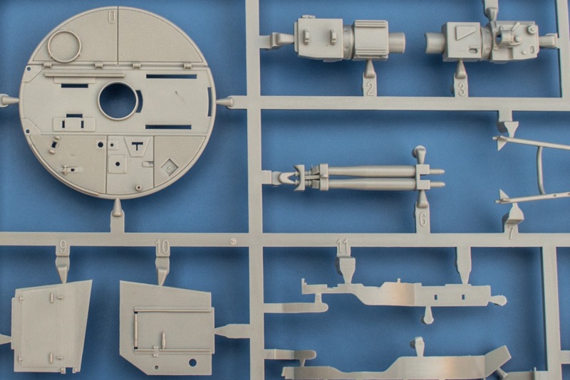 Kennzeichnend für die späteren Fahrzeuge der Ausf. D waren der Maybach HL230P mit dem kastenförmigen Kombinationsluftfilter , den gegenüber der frühen Version anderen Lüftungsgittern auf dem „Motordeck“ hinter dem Turm sowie Laufrollen mit 24 anstelle der zuerst verbauten 16 Schrauben am äußeren Umfang. Einige Fahrzeuge gab es auch mit werksseitig aufgebrachtem Zimmerit. Solch ein Fahrzeug stellt dieser Bausatz dar, die Oberwanne, der Turm und diverse Anbauteile sind mit Zimmerit „belegt“, genauer gesagt mit dem waffelförmigen Zimmerit. Takom hat auch alle übrigen Merkmale berücksichtigt so dass am Ende ein recht stimmiges Fahrzeug herauskommt. Das geht sogar so weit dass man hier einen anderen Rahmen für die Kettenglieder vorfindet, diese hier haben vier diagonale, erhabene Linien anstelle der zwei kleinen parallelen Sicken auf den Stegen an der Außenseite.