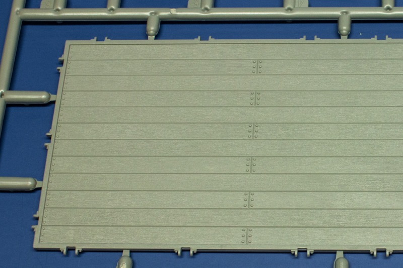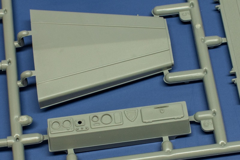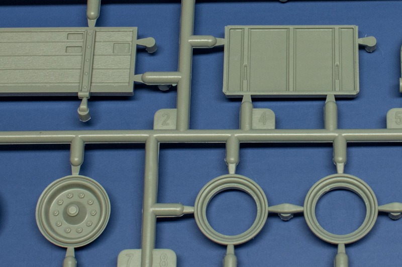 Vom Faun L900 und dem Sd.Ah.115 gab es in 1:35 bisher nur Resinmodelle z.B. von Elite Models oder Customscale zu kaufen. Dieser Bausatz schliesst nun diese Lücke und vereinigt beide Bausätze in einem Paket. In Zukunft werden diese sicherlich auch einzeln zu haben sein, der Aufbau erweckt zumindest diesen Eindruck. In der sehr ansprechend gestalteten, hochwertigen Box befinden sich insgesamt 9 Rahmen in hellgrauem Kunststoff von denen fünf für den L900 und vier für den Anhänger vorgesehen sind. Hinzu kommen noch einige Klarsichtteile und ein paar Messingstäbe (nur für den L900). Die Bauteile machen einen sehr guten Eindruck und sind schön detailliert. Die Teile mit Holzoberflächen weisen eine feine Maserung auf. Einige Teile sind sehr filigran und man muss beim Heraustrennen sehr vorsichtig zu Werke gehen. Die Angüsse sind geschickt platziert, da wo sie z.b. an zylindrischen Teilen liegen sind sie soweit möglich klein gehalten worduch sich die Nacharbeit in Grenzen hält. Der Formenbau ist konventionell, d.h. hier wurde kein Gebrauch der Sliding-Mould-Technologie gemacht. Es gibt einige Auswerferspuren die man ggf. beseitigen sollte. Sie liegen meist auf Innen- oder Unterseiten. Man sieht sie also nur wenn man das Modell herumdrehen würde.