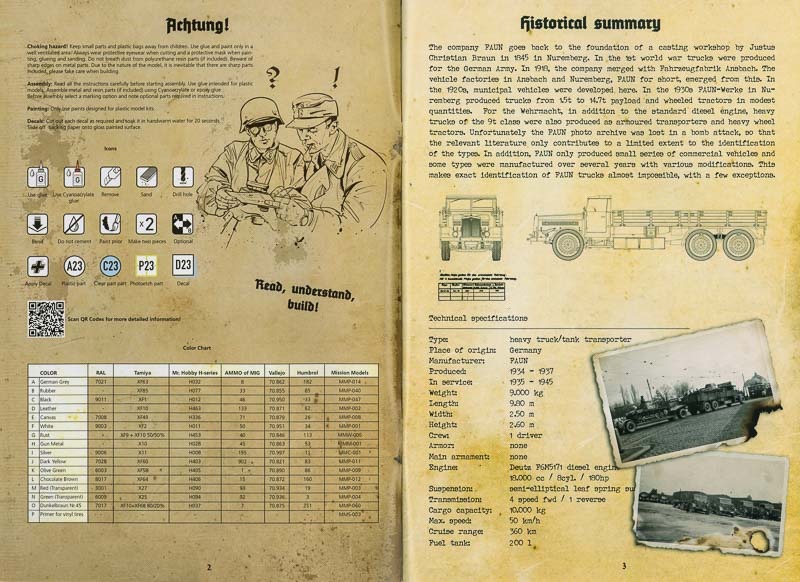 Beim Anhänger gibt es ja diverse Optionen beim Bau, diese sind in der Anleitung sehr gut und übersichtlich dargestellt. Beim Faun findet man dagegen Vorschläge was man Alles auf die Pritsche „fahren“ kann. Die Bemalungshinweise beschränken sich auf das allernötigste und man findet sie nur bei der Decalanleitung. Bei der Detailbemalung ist man auf sich alleine gestellt. Dafür ist die Farbentabelle sehr ausführlich mit Angaben für sechs Hersteller und für das RAL System. Der Decalbogen enthält jede Menge Nummernschilder und Zahlen so dass man Ende beim Faun die Wahl zwischen 7 nicht näher bestimmten Fahrzeugen hat. Das markanteste sein von dem es unter den grauen Mäusen dürfte hier „Erika auf Urlaub“ sein von dem sogar ein Foto im Netz zu finden ist, z.B. auf der „Das Werk“ Seite von Uschi van der Rosten. Allerdings glaube ich dort ein festes Dach anstelle des Softtops erkennen zu können. Wer sich übrigens für die Macher hinter „Das Werk“ interessiert findet am Ende der Anleitung die Kurzporträts aller Beteiligten.