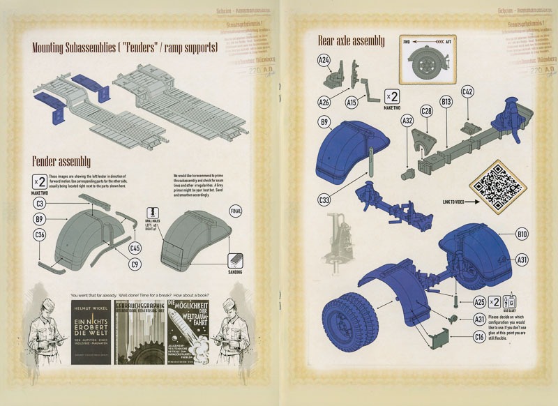 Die beiden Bauanleitungen bzw. Konstruktionsanleitungen“ sind im Stile einer Zeitgenössischen Broschüre aufgemacht. Auch hier sieht man wieder dass es sich um eine Zusammenstellung zweier sicherlich demnächst auch einzeln erhältlicher Bausätze handelt. Gedruckt wurde die Anleitung auf Hochglanzpapier. Die Skizzen sind mit CAD erstellt und mit der vollen Detaillierung versehen, ähnlich wie z.B. bei Takom. Die bereits verbauten Teile sind etwas blasser dargestellt und diejenigen die gerade neu hinzukommen sind hellblau hervorgehoben. Hin und wieder sind Tips und Hinweise eingearbeitet worden, stellenweise auch in Form eines QR Codes der auf ein Video verlinkt ist. Besonders beim Anhänger wurde reger Gebrauch von dieser Form der Zusatzinformation gemacht. Anscheinend waren hier zwei „Bauplandesigner“ bei Das Werk am Werk. Die Anleitung für den Faun wirkt durch die Normschrift und die fehlenden „künstlerischen“ Aspekte etwas nüchterner und für mich daher auch ein wenig klarer. Beim Anhänger wurde der „Kunst“ viel Platz eingeräumt wodurch die eigentlichen Baustufenskizzen etwas in den Hintergrund rücken. Es gibt auch einige Vorbildfotos in den Anleitungen, leider nur in Briefmarkengröße. Nachtrag: Bei der Anleitung des Anhängers wurden die falschen Buchstaben verwendet. Es gibt dort keine Rahmen A, B,C sondern F, G und H, die Reihenfolge passt stimmt aber wieder, A=F, B=G und C=H.