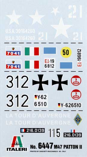 Abziehbilder/DecalsDie gut gemachten Abziehbilder enthalten Markierungen für insgesamt vier Fahrzeuge (USA, Deutschland, Italien, Frankreich). Da das Fahrzeug beinahe weltweit exportiert wurde, stehen (nach entsprechenden Nachforschungen) natürlich auch andere, teilweise recht exotische Einsatzländer zur Auswahl (Äthiopien, Iran, Jugoslawien, Schweiz, Jordanien ...). Auch die möglichen Bemalungsvarianten sind fast unbegrenzt.