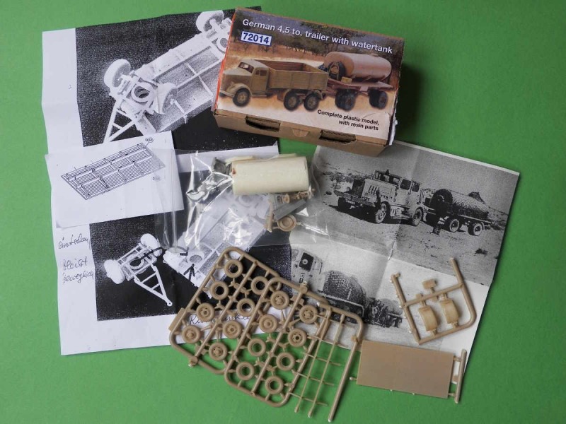 Wenn man zur EME nach Lingen fährt, stellt man nicht nur aus, begutachtet andere Modelle, führt angeregte Gespräche mit anderen Modellbauern, sondern man kauft auch bei zahlreichen Händlern, was das Modellbauerherz begehrt. Schatton Modellbau hatte auch die neusten Produkte dabei, unter anderem den Bausatz „German 4,5to. Trailer with Watertank“. Den habe ich mir gleich gekauft. In der kleinen, braunen Pappbox (auch schon von anderen Schatton-Bausätzen bekannt) befinden sich 34 Teile, davon acht Stück aus Resin. Größtes Resinteil ist der Wassertank, sauber gegossen. Auch der Anguss ist bereits weitgehend entfernt, so dass fast nur noch der Feinschliff nötig ist. Die anderen Resinteile sind die 3 Tankträger sowie die schon aus den Bausätzen der Einheitsanhänger von Schatton bekannten Teile für den Unterbau. Auch die Spritzgussteile sind bereits bekannt: die Räder, die Ladefläche, den Träger der Ladefläche, die Achsen und die Anhängerkupplung findet man bei den verschiedenen Kits des Mercedes L4500 sowie den anderen Anhängern. Alle Teile sind in guter Qualität und ordentlicher Detaillierung.