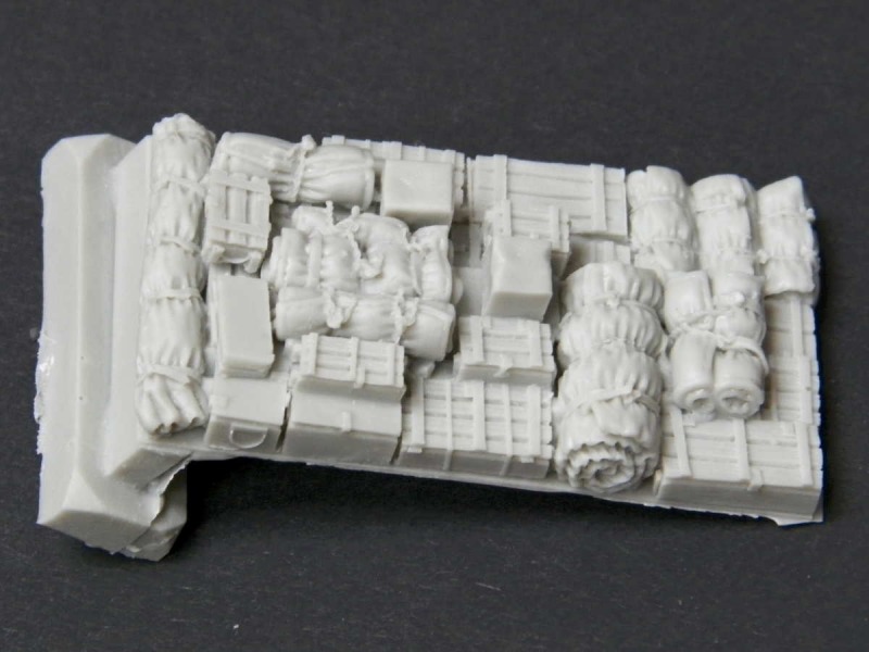 Black Dog hat sich auf Zubehörsets für die verschiedensten Modelle und Bereiche spezialisiert. Neben den Beladungssets für die Opel-Blitz-Busse von Roden gibt es auch ein Set für den Vomag Omnibus. Das Set ist recht übersichtlich, denn es besteht nur aus zwei Teilen: eine große zusammen gelegte Plane für das Dach und Kisten sowie gerollten Planen für den Dachgepäcktäger. Die Herausforderung bei der Verwendung des Sets liegt nicht so sehr im modellbauerischen Bereich - es müssen nur die Angüsse entfernt werden, sondern in der farblichen Gestaltung. Die kompakte Gestaltung von Kisten und Planen erfordert feine Pinsel und eine ruhige Hand. Die Strukturen sind fein herausgeabeitet und sicher auch nach dem Farbauftrag erkennbar. Auch die Gussqualität ist sehr ansprechend, alles blasenfrei und sauber.