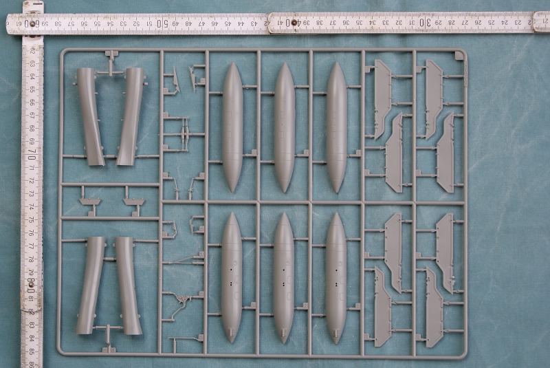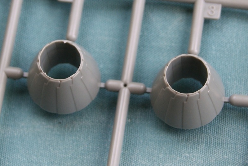 Die Triebwerkseinläufe sind als nahtlose Teile ausgeführt, die über die zweiteiligen Einlaufschächte zum Bauteil mit den Triebwerksschaufeln führen. Der Aufbau sorgt grundsätzlich für eine gute Detaillierung, wie gut sich die drei Einlaufteile zu einer nahtlosen Einheit zusammenfügen lassen, muss sich beim Bau zeigen. Ähnlich dürfte es sich bei den Auslässen verhalten: die Nachbrennerrohre mit ihrer inneren Riffelstruktur sauber zu verarbeiten, mag zu einer Herausforderung werden. Die abschließenden Turbinenteile mit den Nachbrennern könnten zwar besser detailliert sein, werden aber voraussichtlich durch die recht engen Mündungen der Auslassdüsen kaum sichtbar sein.