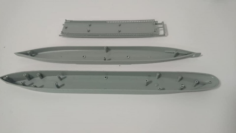 Es bleibt einem schon die Spucke weg, wenn man sich den wirklich wunderschönen Rumpf anschaut. Der besteht aus drei Teilen. Unterwasserschiff, Mittelteil und Decks sind separat ausgeführt worden. Damit kann man eben ohne hohen Aufwand ein Wasserlinienmodell bauen. Die Trockenprobe bestätigt eine exzellente Passform.