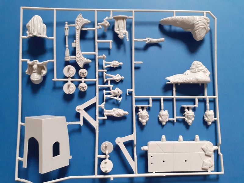 Dieses Set stellt den Thronsaal von "Jabba dem Hutt" aus den Star Wars Filmen dar. AMT-ERTL brachte es 1996 auf den Markt. Die Figuren bestehen aus Polystyrol-Hartplastik. Leider sind einige Figuren proportional nicht gut gelungen. Viele wirken sehr dünn und flach. Einige haben auch keine schönen Details. Zur Passgenauigkeit kann ich nichts sagen, gehe aber davon aus, dass ein wenig Spachtel gebraucht wird. Einen Maßstab gibt es nicht. Schätzen würde ich die ganze Szene etwa auf 1:65, mit guten Willen auf 1:70.