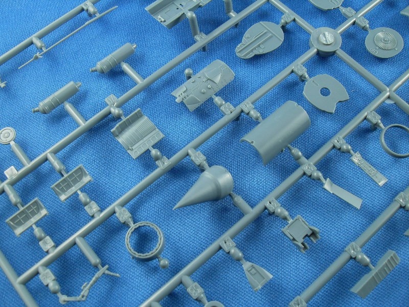 Spritzlinge D, H und I: "D" enthält Teile für das Cockpit, das Fahrwerk sowie diverse Kleinteile. Alle Teile sind fein detailliert und geben auch "out-of-box" ein passables Bild ab. Für Spritzgussverhältnisse ist das Cockpit sehr detailliert. Sehr schön sind auch die Starthilfsraketen, die ebenfalls im Bausatz enthalten sind. Auch diese Spritzling enstammt dem MF-Bausatz. "H" enthält spezifische Kleinteile für die PFM-Version wie bspw. den Schleudersitz, weiteres Cockpitinterieur und den Kanonenbehälter GP-9. "I" enthält die Klarsichtteile für das Cockpit sowie für den Fahrwerksbereich. Auch diese sind in Sachen Detaillierung und Qualität spitze.