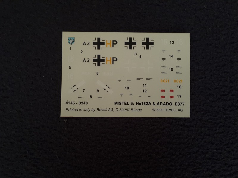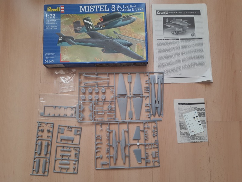 Ursprünglich kam der Bausatz Anfang der 1990er Jahre bei Dragon zunächst als einzelne He 162 auf dem Markt, später wurde sie auch von Hasegawa veröffentlicht. 1991 wurde dann die He 162 noch um die Arado E377 erweitert und so entstand der Bausatz der Mistel 5. Im Jahr 2000 erwarb dann Revell die Formen von Dragon, nach dem diese den Bausatz auch bei DML und Dragon Shanghai ins Programm genommen hatten. Bis dahin hatte Revell die Formen von Frog (1970) für ihre Heinkel He 162 genutzt und diesen Bausatz 1994 das letzte Mal veröffentlicht. Allerdings war dieser nicht mehr zeitgemäß. Außer den Formen von Frog gab es zu diesem Zeitpunkt nur die von Lindberg, welche schon 1965 erschien. So war die He 162 von Dragon die beste, die man auf dem Markt in 1:72 finden konnte. Mit der Ergänzung zur Mistel 5 hatte sie nun auch ein Alleinstellungsmerkmal mit hervorragender Qualität. Umso erfreulicher war es dann, dass Revell diese Formen ergattern konnte, insbesondere weil der Internethandel im Jahr 2000 noch nicht so ausgereift war. So viel zur Bausatzhistorie….