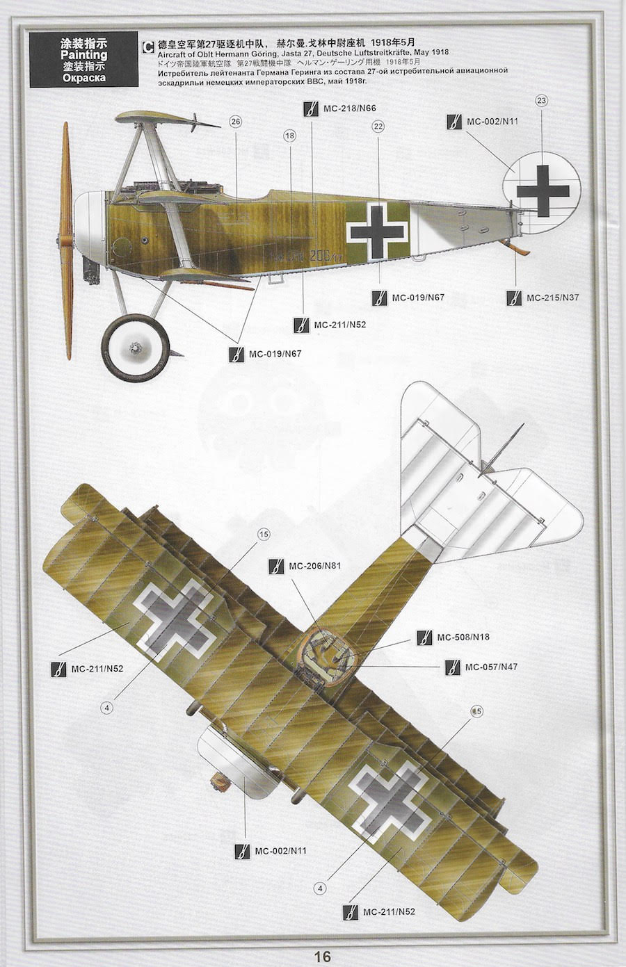 Der Bausatz wurde ursprünglich von Wingnut Wings angekündigt, schien dann aber ebenso „verloren“ zu sein, wie all die anderen angekündigten Neuheiten, nachdem Wingnut (vorerst) das Geschäft einstellte. Als Meng-Model „seinen“ Dr.I Bausatz ankündigte, wurden alle diejenigen, die um die Verbindung von Meng und Wingnut wussten, hellhörig und die zeitgleich auftauchenden Abbildungen ließen im Grunde auch keinerlei Zweifel zu, dass es sich um die von Wingnut entwickelte Dr.I handeln musste. Ich werde daher auch immer von Wingnut als Entwickler sprechen, wenn es in diesem Beitrag um das „Plastik“ und die Ätzteile geht. Anders als von Wingnut geplant, bekommen wir nun alle Bauteile, die für den Bau von beinahe jedem denkbaren Dreidecker benötigt werden, in einer Schachtel. Für die vier Abziehbildvarianten des Bausatzes werden aber nicht alle Bauteile benötigt, doch dazu später mehr. Um es gleich am Anfang zu sagen, wenn man dieses Produkt zum ersten Mal in die Finger bekommt, weiss man, was es bedeutete, einen „echten“ Wingnut zu bekommen! Bevor man feststellt, dass man letztlich gutes „Plastik“ bekommt, sieht man zuerst das lächerliche Deckelbild. Der uninspirierte Bauplan wanderte bei mir nach dem ersten „Anblättern“ sofort zur Seite, die Abziehbilder auch. Alles wahrlich nicht schön. Die beigelegten „historisch“ angehauchten Infoblätter sind überwiegend in chinesisch gehalten und das, was man lesen kann, ist vollkommen unbedeutend. Da kann man bei Wikipedia mehr lernen! Keine Ahnung, was Meng damit bewirken wollte. Erst beim Anblick der Spritzlinge steigt die Stimmung wieder, denn man kann schon auf dem ersten Blick erkennen, dass es sich um einen Wingnut-Bausatz handelt, wenn auch mit gewissen Abstrichen, doch auch dazu später mehr.