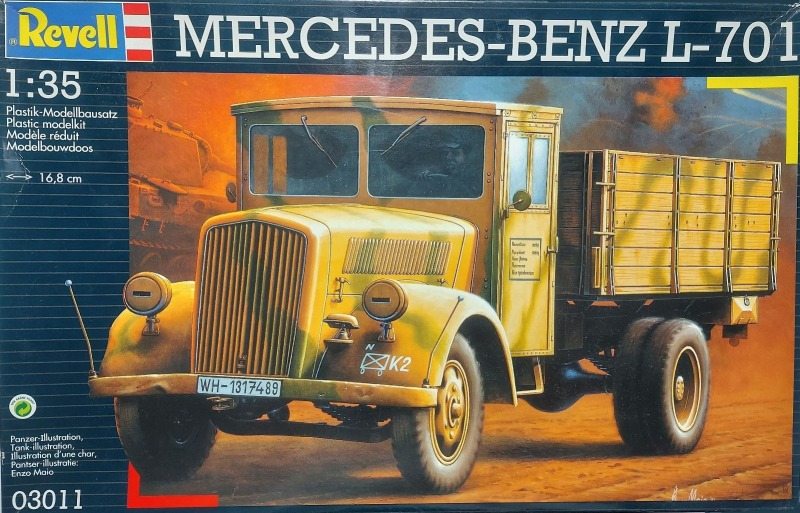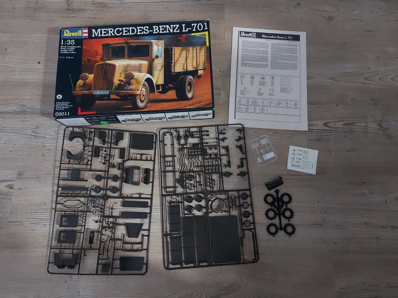 Der Mercedes L-701 ist im Modellbau eine Rarität, zugegeben, die meisten Hersteller werden wohl auf das bekanntere Vorbild, den Opel Blitz setzen, auch weil der L-701 wohl wenig Wiedererkennungswert, bzw. Alleinstellungsmerkmale hat, so fehlt der Blitz als auch der Stern und es sind auch nur einige tausend Exemplare an die Front gerollt. Doch Revell nutzt die Grundlage des Opel Blitz von Italeri und entwickelte im Jahr 1996 einen Bausatz vom Mecedes L-701. Die Grundlage erschien 1973, damals noch unter dem Namen Italaerei. In den folgenden Jahren erschien der Opel Blitz dann auch in Zusammenarbeit mit Revell, Testors, Heller und Tomy. Wie bereits erwähnt, folgte 1996 die Auflage als L-701 bei Revell, 2007 wurde auf Grundlage der Bausatzform noch der L-701 mit Kohleantrieb, das Kfz. 385 Tankwagen, aufgelegt.