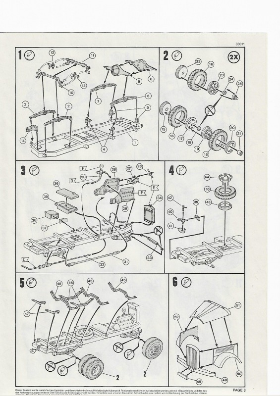 Es empfiehlt sich, dass Fahrzeug in den drei angegeben Baugruppen (Fahrgestell, Fahrerhaus und Aufbau) zu bauen, anschließend zu lackieren, und erst dann zusammen zu setzen.