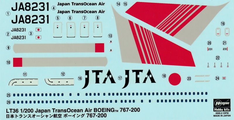 Besprechung:Zum VorbildAllgemeine Angaben zur Boeing 767 findet man hier: Wikipedia, Boeing, Fliegerweb. Zum konkreten Vorbild des Bausatzes: die JA8231 wurde als 767-246 im Juli 1985 an Japan Airlines ausgeliefert. Motorisiert mit 2 Pratt&Whitney JT9D-7R4D_Triebwerken. Es hätte auch eine Alternative von General Electrics gegeben. Das ist wichtig zu wissen, denn Hasegawa unterscheidet auch zwischen beiden Triebwerken, hier sind die richtigen dabei. Wer eine andere Maschine, andere Airline darstellen will, muss darauf achten. Die Japan Trans Ocean-Decals des Bausatzes zeigen das Erscheinungsbild dieses Flugzeuges von Juli 1993 bis Mai 1995, als die Maschine vom Eigentümer JAL (Japan Airlines) an JTO (Japan Trans Ocean) verleast war. Nach 1995 wurde die Maschine in die USA verkauft, wo sie nach längeren Abstellzeiten 2017 verschrottet wurde. Quellen: Planespotters.net, Airfleets.net. Der BausatzDie 767 wurde von Hasegawa erstmals 1983 als Bausatz in 1:200 angeboten, damals als ANA (All Nippon Airways). Im Lauf der Zeit erschienen Wiederauflagen als Delta, JAL, Air Canada und 1999 gab es eine militärische Variante als AWACS mit großem RADOM am Rumpfrücken. Seither haben die Rumpfformen kleine Befestigungsstege, die bei den Zivilmaschinen zu entfernen sind. Der vorliegende Bausatz ist 2000 erschienen, hat daher dieses "Souvenir aus dem Militärdienst". Ansonsten ein simpler, gekonnt vereinfachter Bausatz mit sehr guter Paßgenauigkeit der Teile, aber sehr geringer Detailierung. Die Tragflächen haben erhabene Panellines, der Rumpf versenkte Trennlinien der Teile, aber die Tiefe und Breite dieser Gravuren vertragen viele Grundierungs- und Farbschichten. Zur Maßstäblichkeit: Rumpflänge am Modell beträgt 240 mm - es sollten 242,5 sein. Die Spannweite ist mit 238 mm absolut korrekt. Gut finde ich den Hinweis auf die Triebwerksvariante, es gibt nämlich auch Hasegawa-767er mit dem anderen Typ.