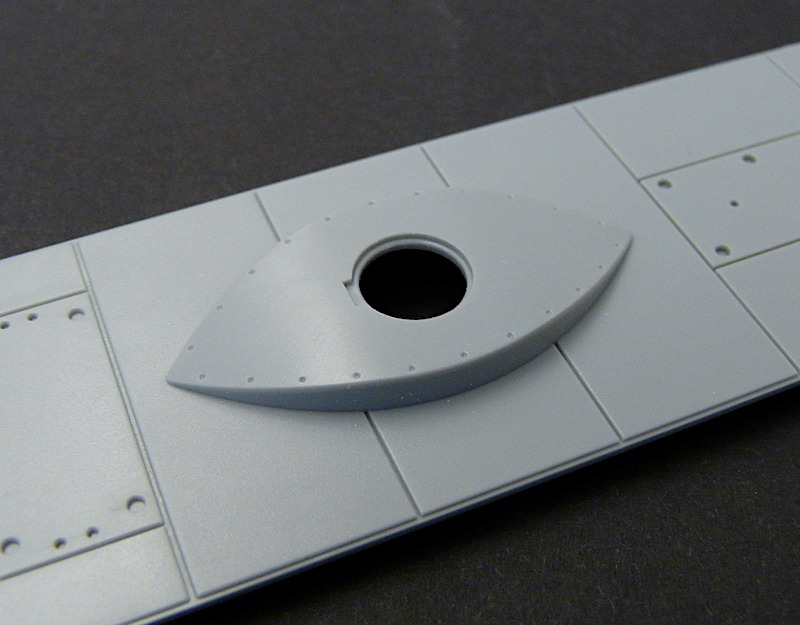 Das eigentliche Highlight des Rumpfes ist aber die Oberflächengestaltung: eine Darstellung der von Hand genieteten Platten, wie sie ihres Gleichen sucht. Die nicht zu prominenten Nietreihen sind herrlich unegal. Nicht alle sind vollkommen gerade verlaufend, oftmals sitzen die Nieten zu nah beieinander, oder auch mal zu weit auseinander, wie es gar nicht anders sein kann. Erstklassig! Bei den am Rumpf entlang laufenden Dopplerstreifen hingegen, die schon recht deutlich ausgearbeitet sind, bin ich mir nicht so sicher, was ich davon halten soll. Sieht nicht schlecht aus, wirkt aber dennoch übertrieben.