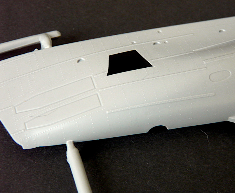 Der Rumpf besteht aus zwei Hälften, die mit drei „Spanten“ versteift werden. Die Hälften weisen eine feine Benietung und erhabene Verstärkungsbänder auf. Des Weiteren gibt es recht tief eingelassene Tritt- und Flutöffnungen die, auch wenn sie nur mit dunkler Farbe ausgelegt würden, ganz gut aussehen müssten. Tatsächlich hat es mich aber nur ca. 15 Minuten gekostet, alle Öffnungen auch wirklich zu öffnen, indem ich von innen Material weggefräst und mit einem frischen Skalpell die Reste entfernt habe. Schnell gemacht und lohnend! Die Flutöffnungen stellen aber leider ein Problem dar.