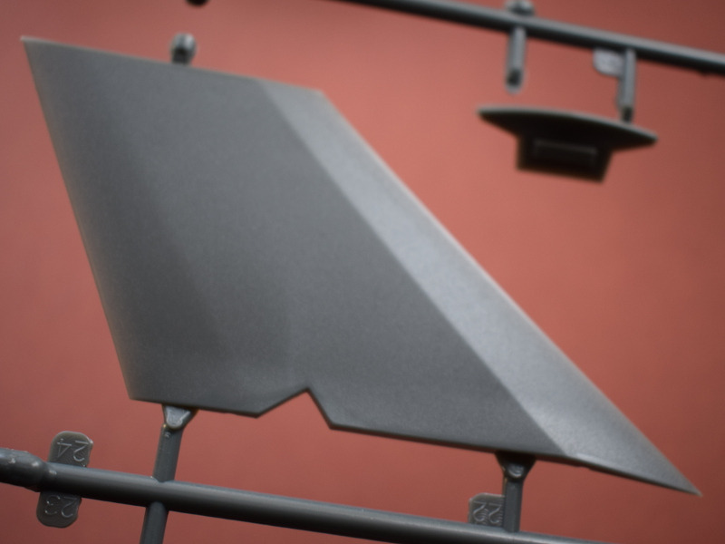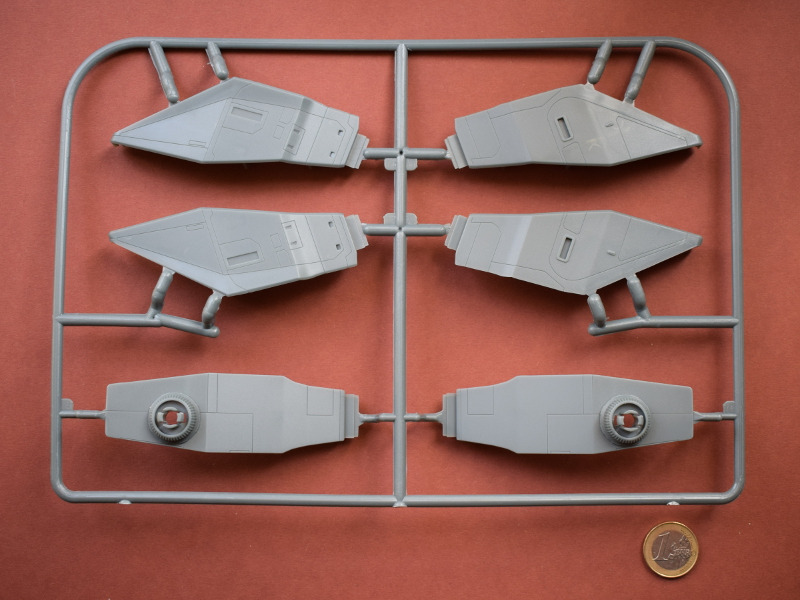 Der Bausatz vom Moebius ModelsDer im Jahr 2017 erschienene Bausatz basiert auf den CGI-Daten, da im Original nur das Cockpit gebaut wurde. Der grafisch ansprechend gestaltete Karton ist bis zum Rand gefüllt und enthält 15 Spritzrahmen mit total 115 Bauteilen. Ein Rahmen weist Unsauberkeiten auf, die aber augenscheinlich nicht die Bauteile betreffen. Bei den größeren Bauteilen finden sich auch recht breite Angüsse. Aber vermutlich war das produktionstechnisch nicht anders umzusetzen. Die Anzahl der versenkten Gravuren und erhabenen Details ist vielleicht nicht so hoch wie bei einem real existieren Original, aber das ist nicht als Nachteil zu werten. Die Klarteile sind von ordentlicher Qualität. Eventuell könnte eine Politur noch vorhandene Unebenheiten beseitigen. Das Modell kann mit folgenden Optionen gebaut werden:
