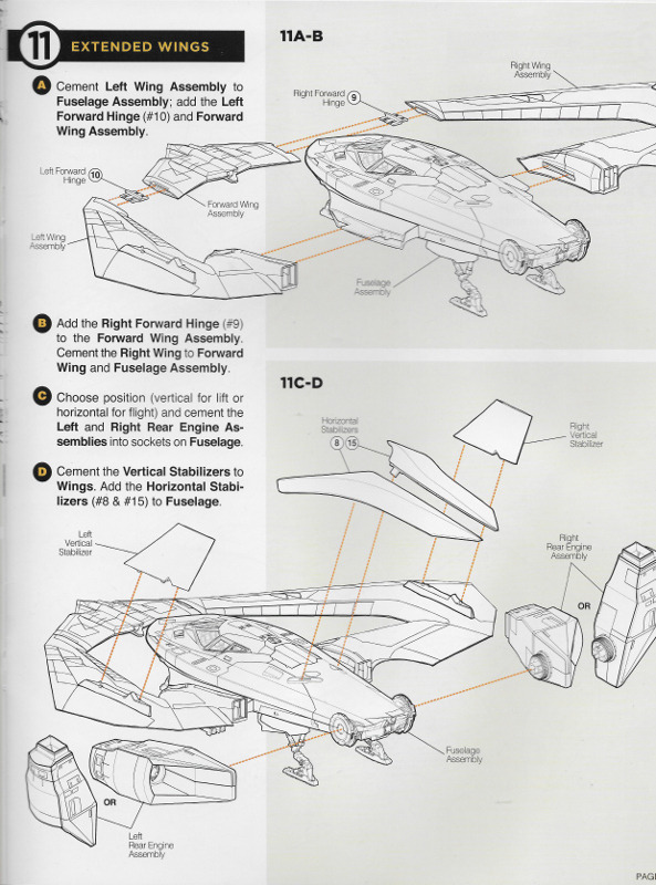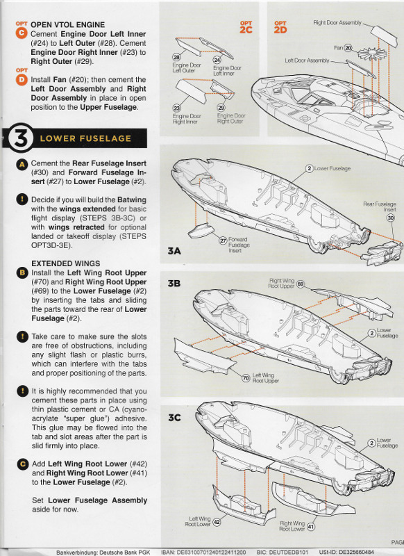 Die BauanleitungGleich zu Beginn weist die Bauanleitung darauf hin, dass man nur die Optionen zwischen aus- und hochgeklappten Tragflächen hat. Beide Optionen sind nicht möglich. Auch wegen der o.g. anderen Bauoptionen muss die Anleitung aufmerksam gelesen werden. Sie besteht aus 15 Seiten und verfügt über leicht verständliche Zeichnungen. Zusätzlich ist jede Baustufe auch als englischer Text erklärt. Auf den beiden letzten Seiten sind Farbfotos eines fertig gebauten Modells als Mehrseitenansichten enthalten. Es gibt nur wenige Farbangaben und diese sind auch nur allgemein angegeben. Farbdetails für z.B. das Cockpit oder die Triebwerke sind nicht vorhanden. Ebenfalls ist ein Markierungsbogen nicht vorgesehen. Stärken: