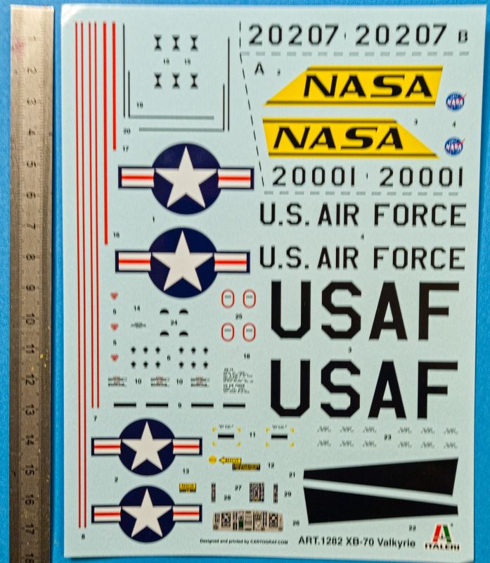 Die Decals von Cartograf sind randscharf und sauber gedruckt. es ist der größte Decalbogen, den ich im Maßstab 1:72 je in der Hand hatte. Die Markierungen erlauben es, die beiden Prototypen der XB-70 darzustellen.