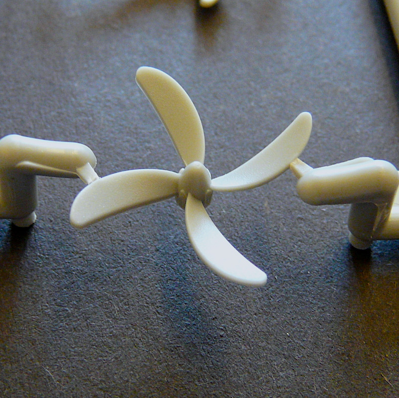 Das Ruderblatt ist Teil der Backbordrumpfhälfte. Die Wellen sind zusammen mit Wellenhosen und Stützen jeweils als ein komplettes Bauteil erstellt. Die beiden Vierblattpropeller mit ihren beinahe sichelförmigen Blättern sind ganz ok, aber man sollte die Kanten der Blätter etwas dünner schleifen.