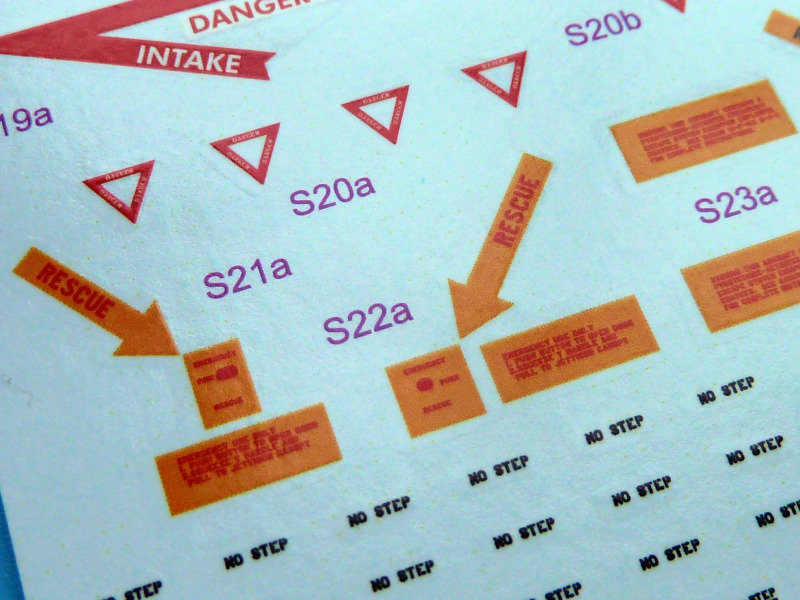 Die beiden Decalbögen enthalten jeweils Beschriftungen und Warn- und Wartungsmarkierungen für den Rumpf und die Außenbord- und Waffenträgerstationen. Eduard weist dabei auf die unterschiedlichen Markierungsoptionen hin (schwarze Decalnummern auf dem Decalbogen - alle Tarnungen, Blau - High-Visibility Tarnungen, Lila - High-Visibility und schwarze Tarnungen, Grün - Low-Vis Tarnungen).